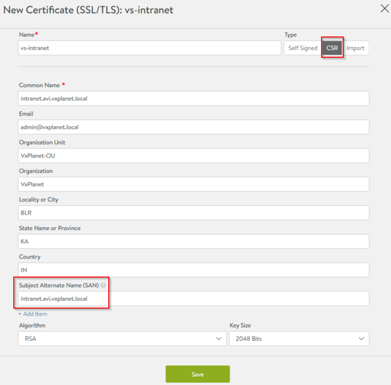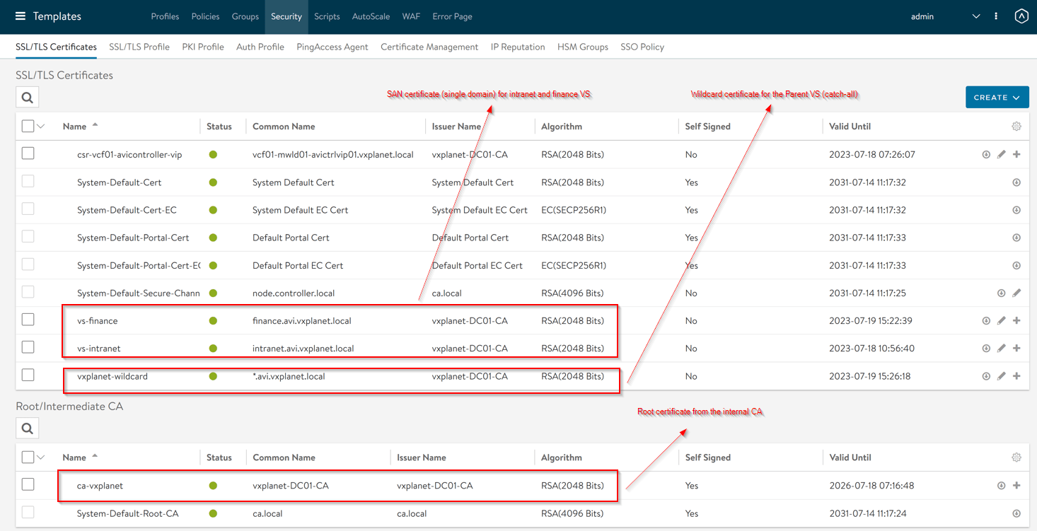 The intranet and finance apps will be hosted on child virtual services and the TLS certificate is a single domain SAN certificate for the app hostnames. The Parent VS will have a wildcard cert (a catch-all vs) as it handles all other traffic not matched by the child VS’es. To ensure that the certificate trust exists, we also import the root and intermediate CA certs into NSX ALB