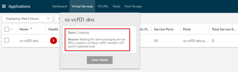 If we selected a dedicated Service Engine Group (SEG), the creation of VS might take some time as the Service engines need to be deployed and initialized in vSphere.