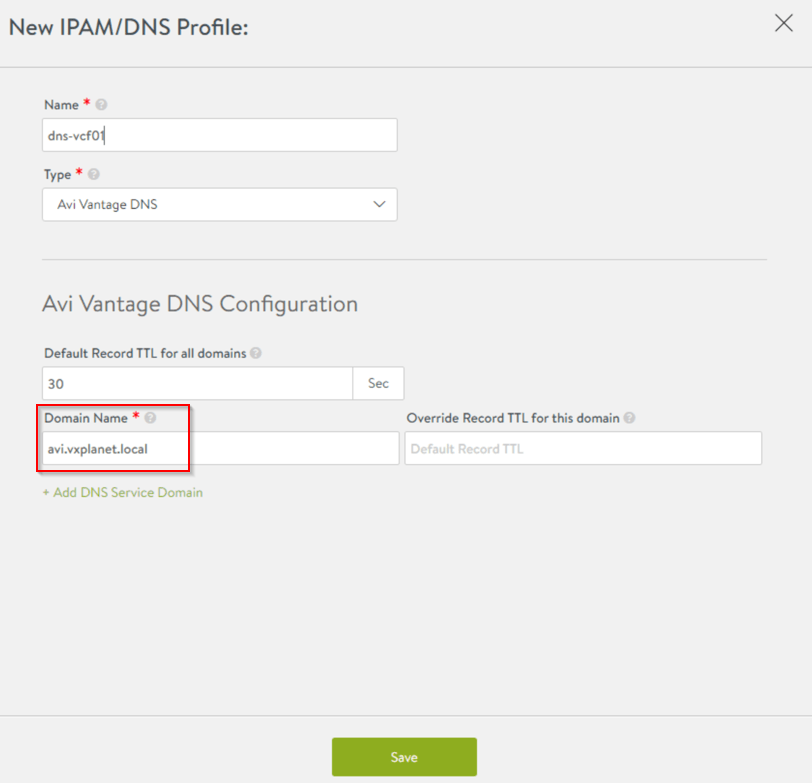 To make configuration easier, let’s define a sub-DNS zone from our corporate DNS network in the DNS profile. The corporate DNS zone is vxplanet.local, and we use avi.vxplanet.local for our deployed applications in NSX ALB.