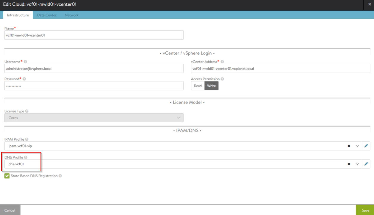 We associate the DNS profile with the vSphere Cloud to make it available for applications deployed in that cloud.