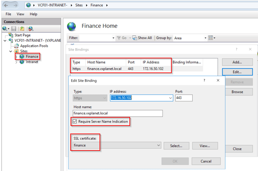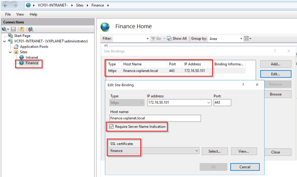 This is the Finance application in Web01 and Web02. This application also has a single domain SAN certificate pointing to the application name – finance.vxplanet.local