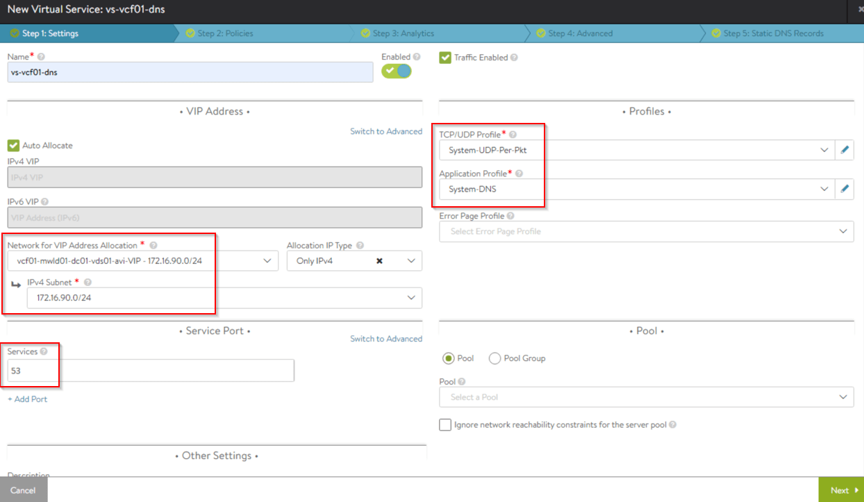 We already have an IPAM profile associated with the vSphere Cloud, hence we select VIP ‘Auto-allocate’. The TCP/UDP profile should be ‘System-UDP-Per-Pkt’ and Application Profile should be ‘System-DNS’.