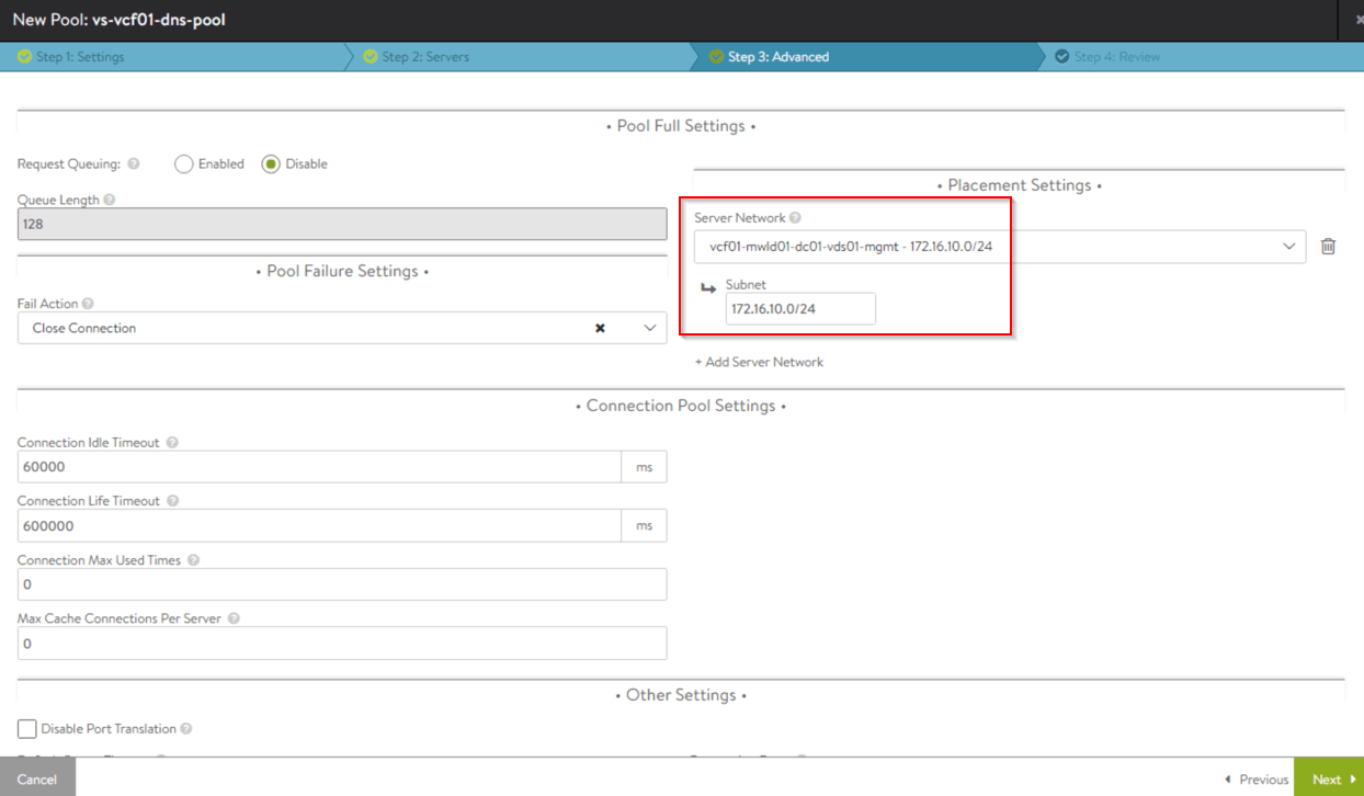 The placement network for the upstream DNS server (pool member) is the Management Port Group in our case: