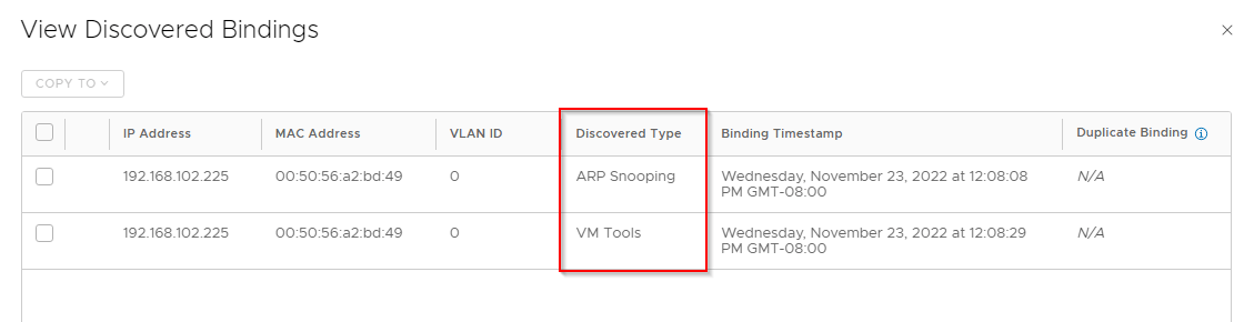 Whenever an IP address is discovered, it is added to the “Discovered bindings table” under the segment from where it is added to the “Realized bindings table”. The way in which realized bindings table is updated depends on two modes – Trust on first use (TOFU) or Trust on Every Use (TOEU). The below screenshots shows the discovered bindings table for a segment port with an IP address 192.168.102.225 which is learned from two sources – ARP snooping and VM Tools.