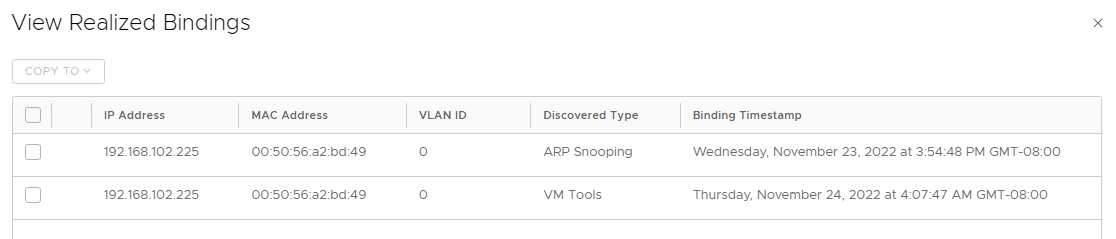 Since TOFU is enabled in the IP discovery profile of the sgment, the first discovered IP addresses are added to realized bindings list as below: