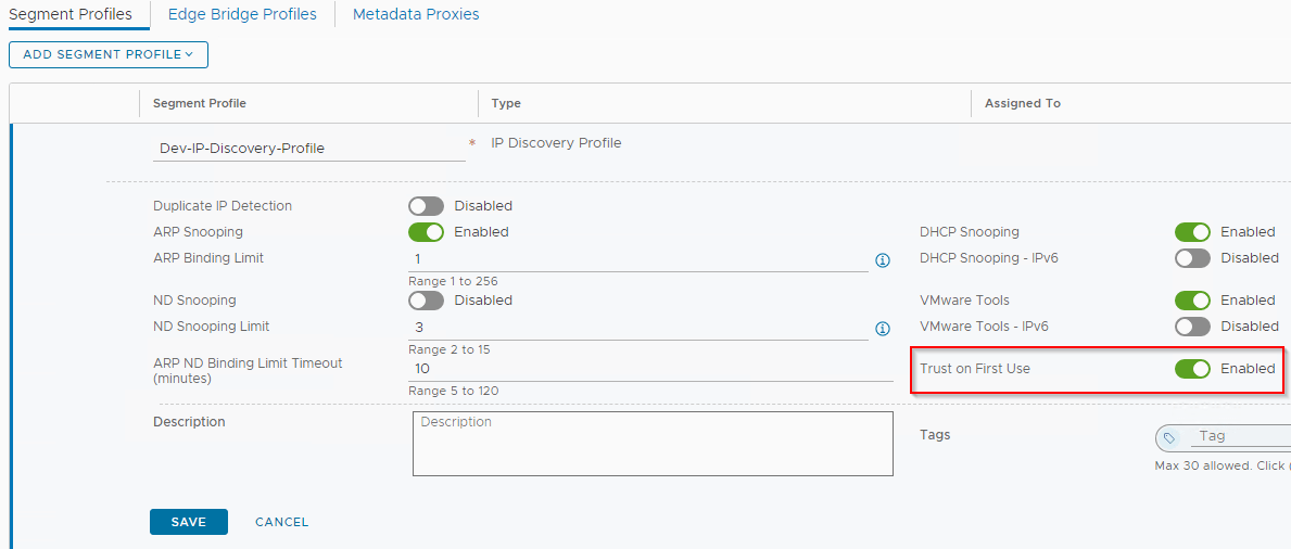 For the same NSX segment discussed earlier, let’s attach a new IP discovery profile with TOFU disabled. This will switch ARP snooping to TOEU mode.