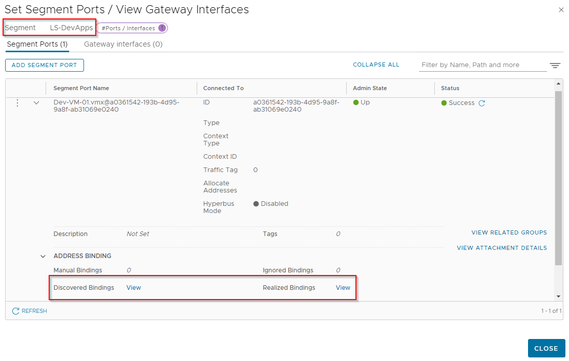 We have a VM “Dev-VM-01” attached to segment “LS-DevApps” with an initial IP address 172.16.50.224. The IP address is discovered from both ARP snooping and VM Tools and will be added to the discovered bindings table which will then go to the realized bindings table.