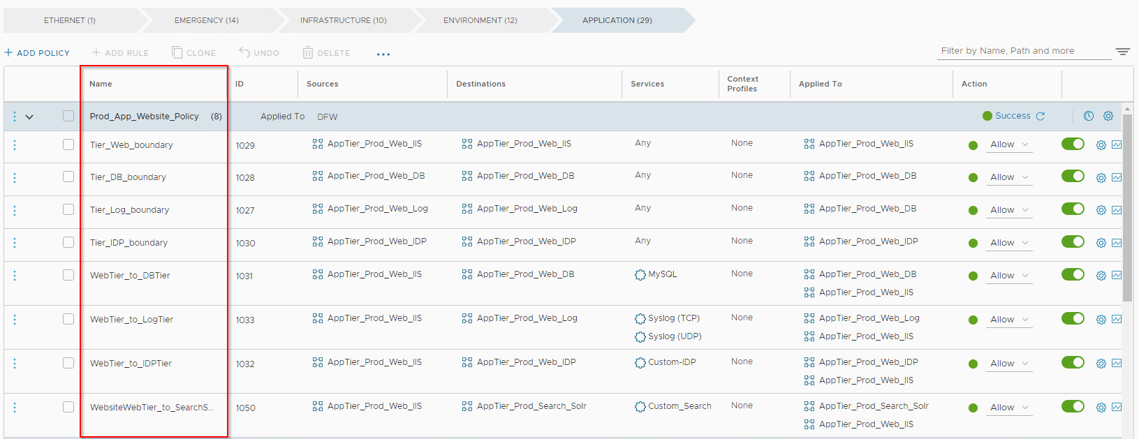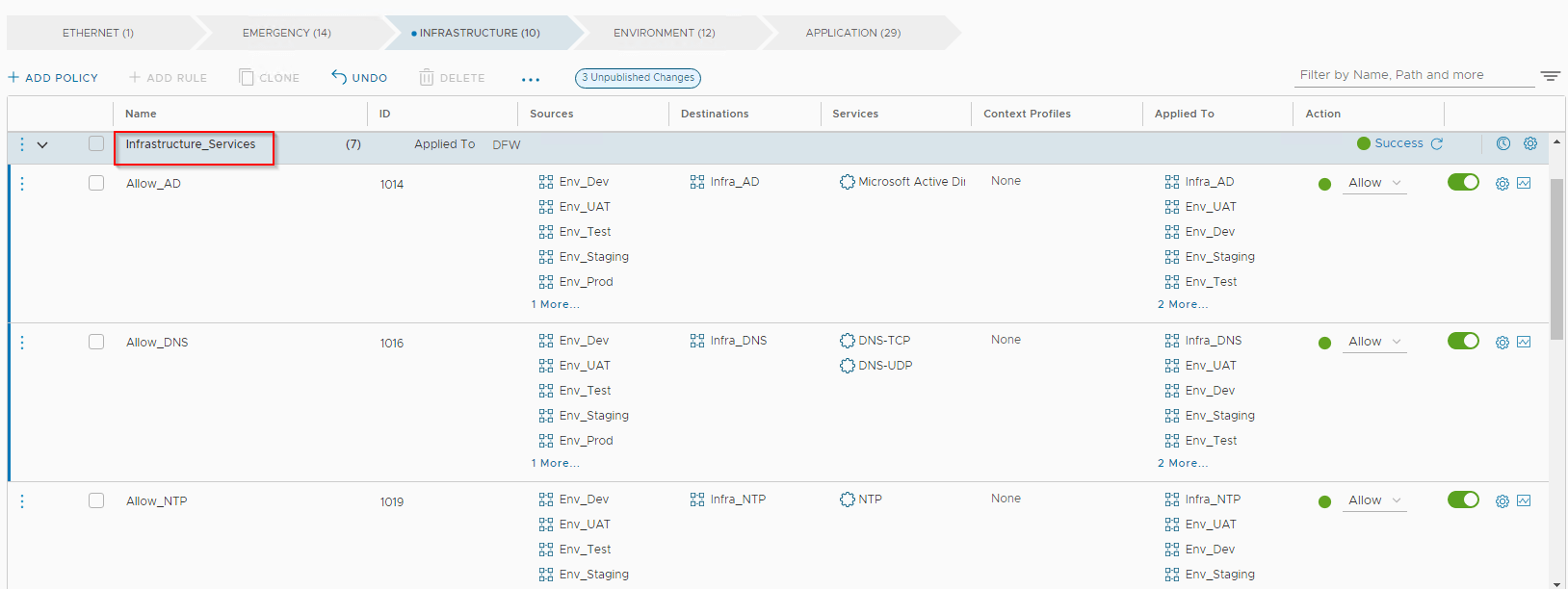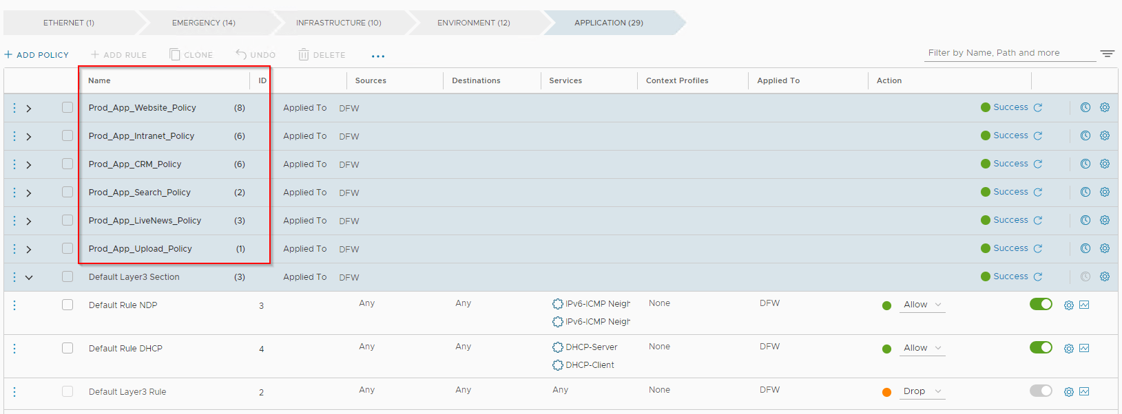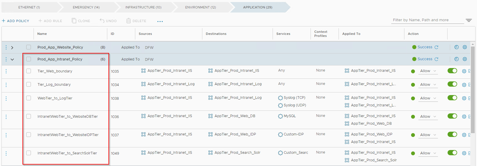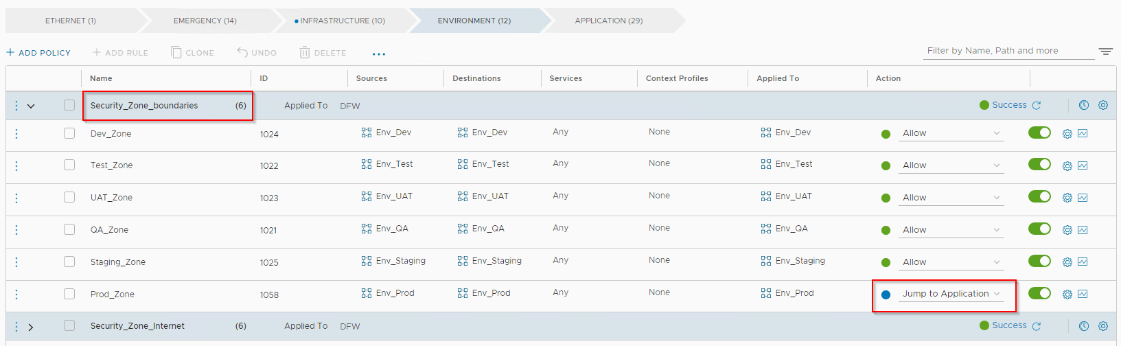 Defining security boundary (zone fencing) was a requirement and we add the policies under “Environment” category. All non-prod will need unrestricted access within their environment. We need to microsegment prod environment, so any traffic hitting the prod environment rule will need to jump to “Application” category to look for more specific app and app-tier policies.
