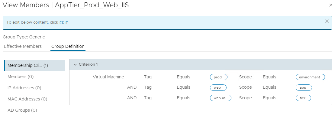 Since our microsegmentation use case is only for Prod environment, we will create additional security groups to define prod application boundaries. The below example shows the boundary for Prod Live website by matching the tag “prod” for scope “environment” AND tag “web” for scope “app”.