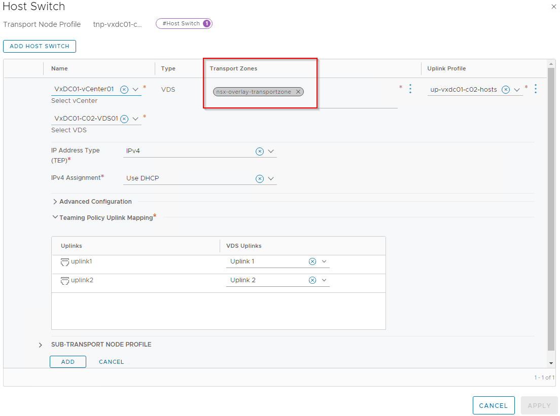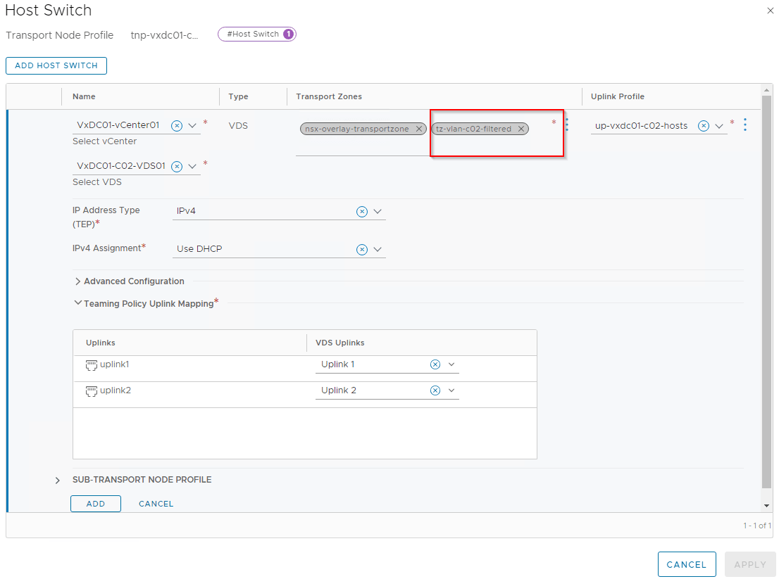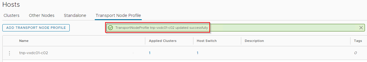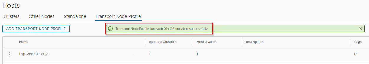 Let’s see what happens when we associate the VLAN transport zone “tz-vlan-c02-unfiltered” to the compute cluster. For this we link the transport zone to the transport node profile.