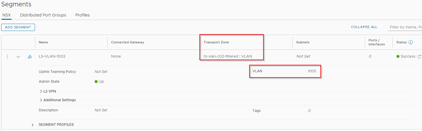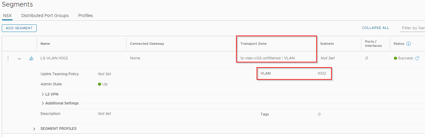 As this transport zone has unrestricted VLANs, NSX tenants would be able to create segments on the VLAN of their choice, say for example VLAN 1002 which is the VLAN for vSAN traffic.