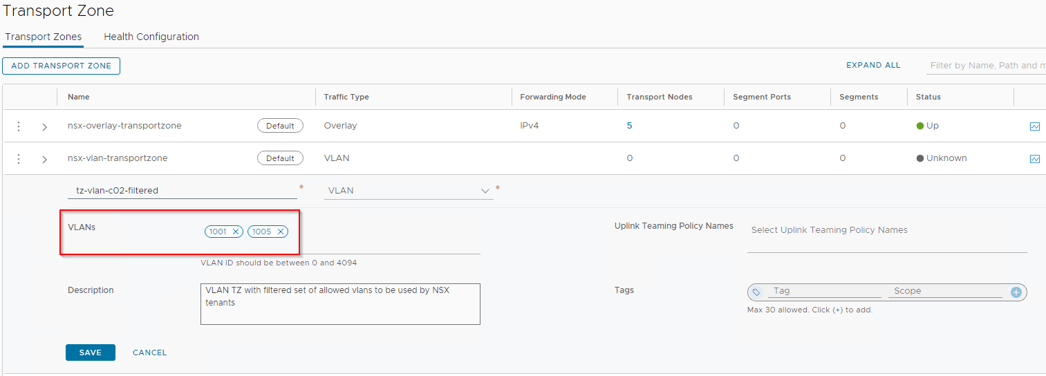 Let’s replace the transport zone “tz-vlan-c02-unfiltered” with “tz-vlan-c02-filtered” that only allows VLAN 1001 and 1005 to be used by the tenants.
