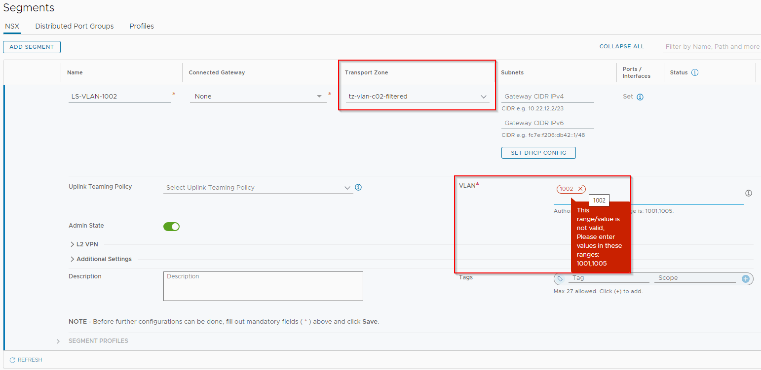 Notice that, the NSX tenants can now only create VLAN segments from the allowed list. For eg: an attempt to create a segment on VLAN 1002 (vSAN) will be rejected, but a segment on VLAN 1005 will succeed.