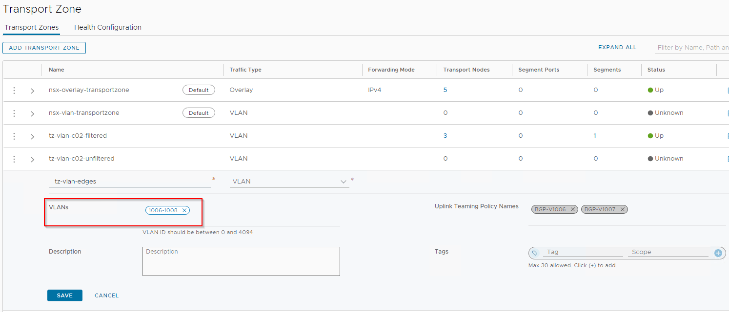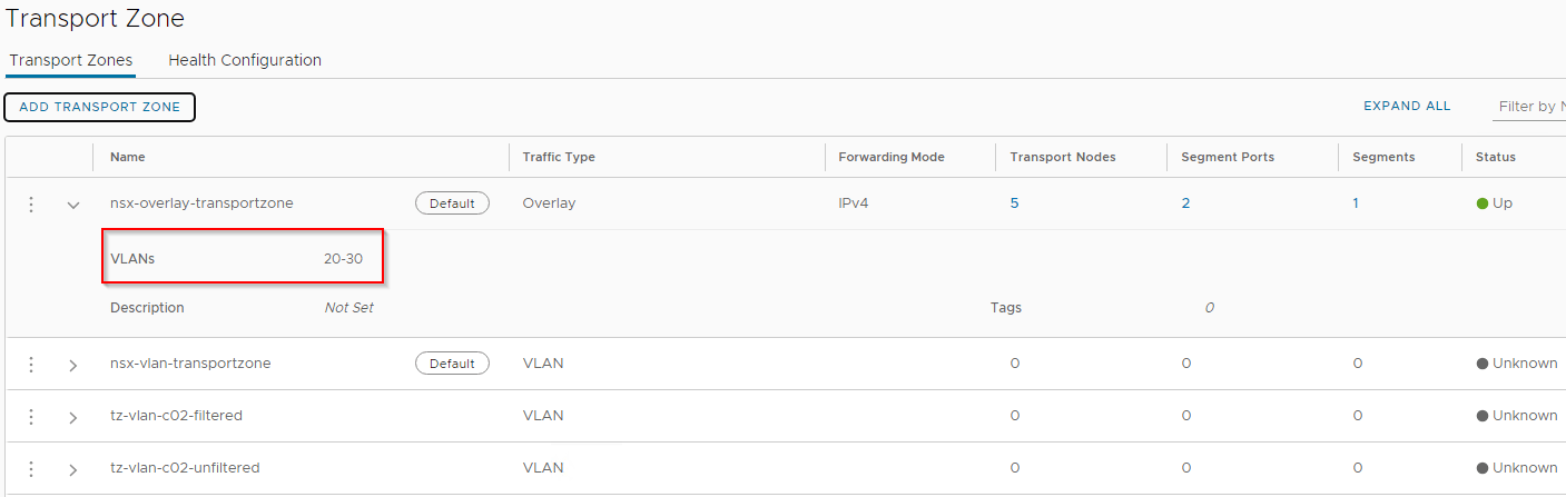 VLAN filtering can also be done on the overlay transport zones to control the VLANs used for guest VLAN tagging (VGT) on the overlay segments. Let’s associate the VLAN range 20-30 to the overlay transport zone.
