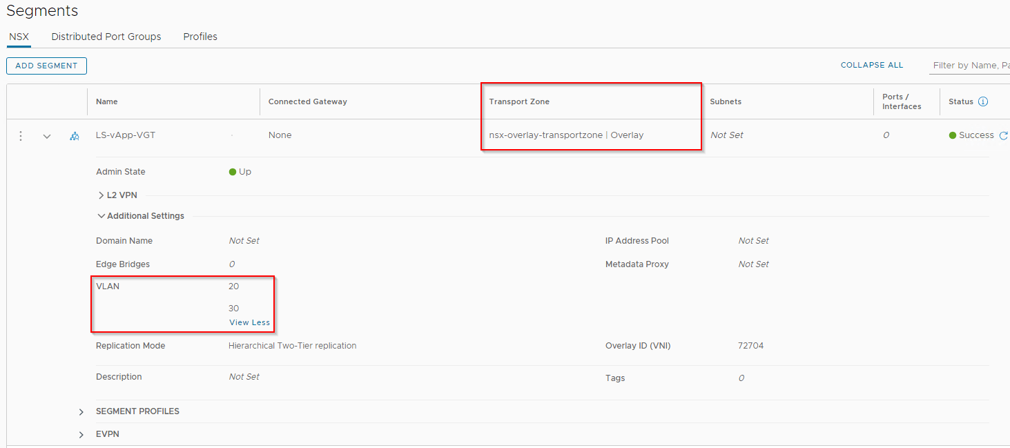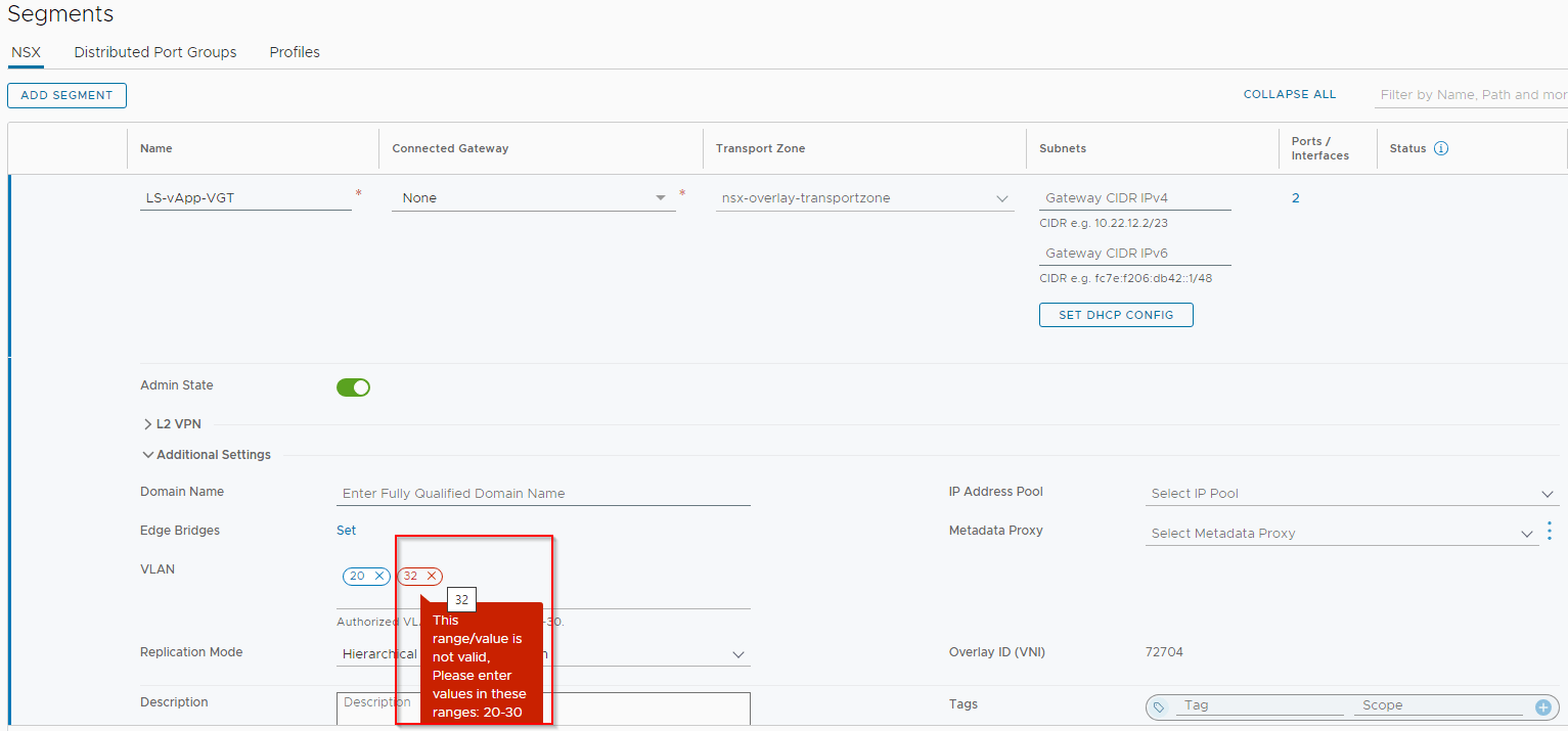 Let’s create an overlay segment and allow VLANs 20 and 30 for guest VLAN tagging. As this is within the allowed range, it should be accepted. Any VLAN outside of the range will be rejected. For eg: we see VLAN 32 is rejected on the segment.