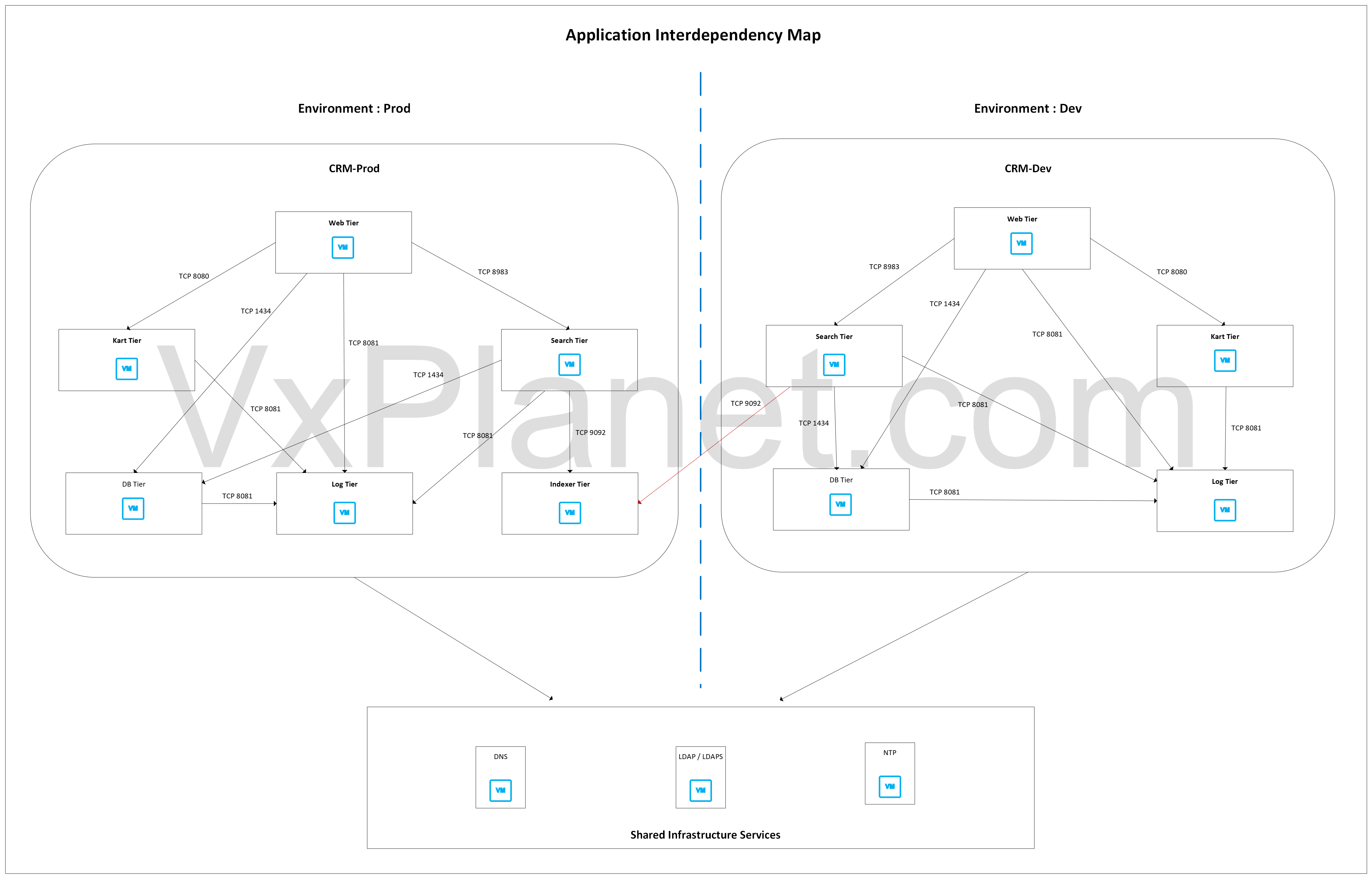 This is how the application interdependency map looks like. Note that there is an inter-environment communication between the CRM-Dev Search Tier and the CRM-Prod Indexer Tier.